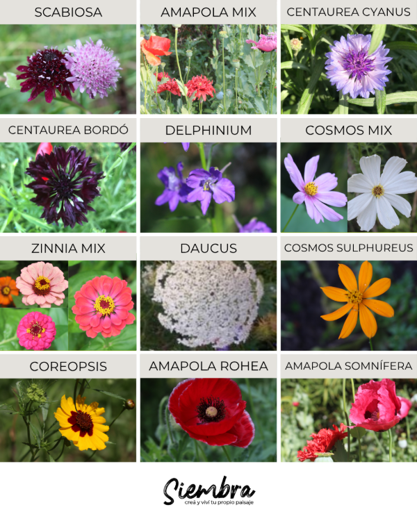 Especies disponibles: Scabiosa Mix, Zinnia, Cosmos Mix (bipinnatus), Cosmos sulfureus, Amapola Mix (somnifera y rohea), Delphinium, Centaurea Bordó, Centaurea Cyanus, Daucus, Coreopsis.